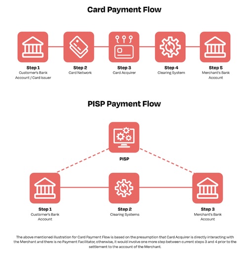 Open Banking service providers such as Token.io and Tink offer secure API connectivity that allows banks and payments service providers to bypass the traditional linear card payment flow. As shown in the adjacent diagram, it enables a more direct path that uses a Payment Initiation Service Provider (PISP) to connect the customer and merchant bank accounts directly, bypassing card networks and legacy systems entirely.