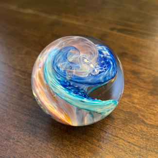 The handmade blown glass paperweight was designed by artist Tyler Kimball of Monarch Glass Studio in Kansas City, Missouri. The design incorporates the organizations' color pallet twisted into a wave pattern provocative of radio ways. The NFC tag on the base serves as both a connection to this page on the NFC Forum website but also protects the art and surfaces.